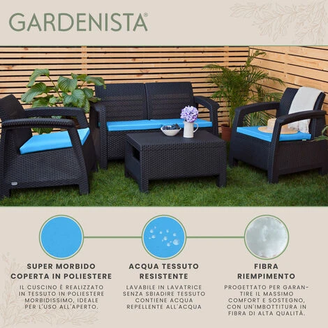I cuscini per sedili Gardenista per rattan sono un set di 4 pezzi realizzati con morbido tessuto in poliestere resistente all’acqua e imbottiti con imbottitura in fibra di alta qualità. I cuscini sono progettati per offrire il massimo comfort pur essendo abbastanza resistenti da resistere agli elementi esterni. Con uno spessore di 5 cm, i cuscini in rattan misurano 56 cm di larghezza e 50 cm di profondità, mentre i cuscini della sedia misurano 50 cm di larghezza e 50 cm di profondità, rendendoli perfetti per i mobili Keter Allibert Carolina. Il tessuto resistente all’acqua dei cuscini assicura che rimangano asciutti anche in condizioni di bagnato, rendendoli una scelta pratica per l’uso all’aperto. L’imbottitura in fibra di alta qualità offre supporto e comfort eccellenti, rendendo questi cuscini un’opzione di sostituzione ideale per i tuoi mobili da esterno.