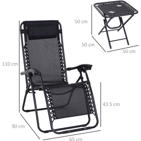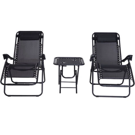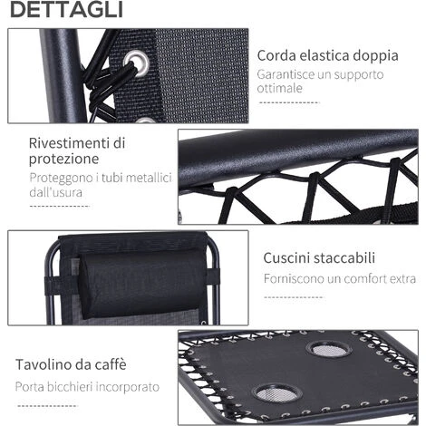 Rilassati all’aperto con questo set da giardino Outsunny. Include 1 tavolino e 2 sdraio da esterno. Struttura in acciaio verniciato nero, anti corrosione. Schienale regolabile. Poggiatesta e bracciolo imbottiti per il massimo comfort. Tessuto di alta qualità traspirante e ammortizzante. Tavolo pieghevole con 2 portabicchieri. Facili da piegare e trasportare.