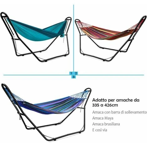 Adatto per amache fino a 4 metri: il nostro supporto universale per amache misura 276 cm (L) X97 cm (P) X 122 cm (H) e pesa 15 kg. La capacità massima di carico di questo supporto per amaca è di 200 kg. Si adatta ad amache da 3,5 a 4 metri di lunghezza ed è adatto per 2 persone.